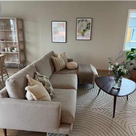 Pent brukt sofa med veldig lite slitasjemerker og sterkt stoff som kan vaskes i vaskemaskin.