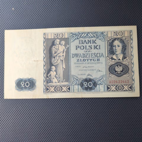 Bank Polski 20 zloty seddel. Polen, pålydende verdi 20 zloty. Egner seg som samleobjekt for mynter og sedler eller som historisk dokumentasjon av polsk valuta.