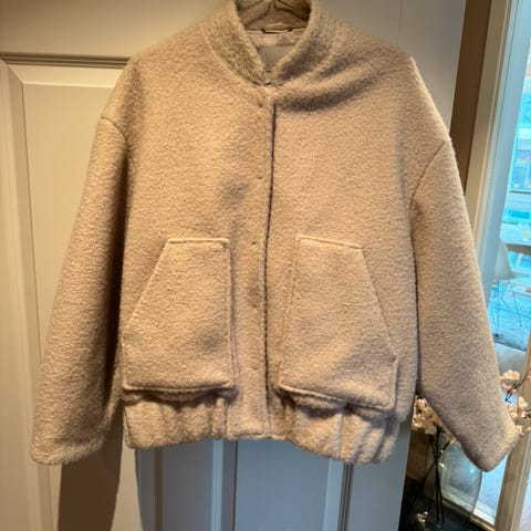 Holzweiler kåpe for dame i størrelse S. Kåpen er i beige fleece-materiale med myk, teksturert overflate. Den har glidelåslukking foran og er helfôret på innsiden.