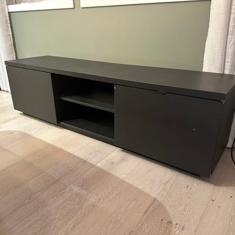 Litte slitasje på hjørner. Har en skyve glassfront. Hyller kan flyttes og tilpasses noe.