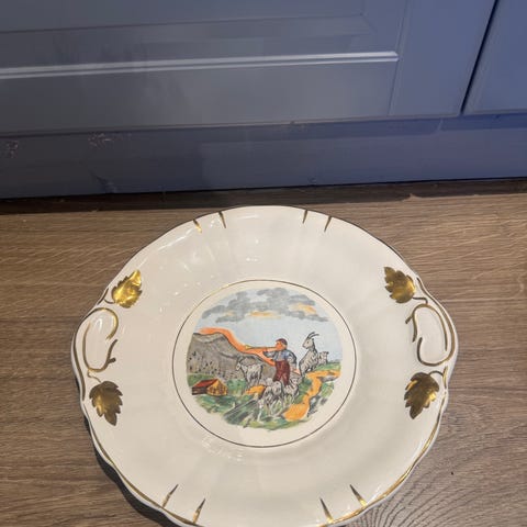 Norsk Flint, Egersund, vintage fat, dekorfat, serveringsfat, keramikk, porselen, norsk keramikk, Made in Norway, retro, antikk, samlerobjekt, hyttepynt, bonderomantikk, landlig stil, gjetergutt, geiter, gullkant, håndmalt motiv, nordisk design, 1950-tallet, 1960-tallet