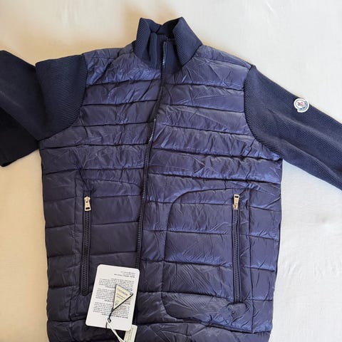 Moncler Grenoble dunvest for herre i størrelse L. Vesten er svart og fylt med dun. Den har høy krage og glidelåslukking i front. Modellen har synlig Moncler-logo på brystet og merkelapp på innsiden. Egnet som ytterplagg eller mellomlag i kjøligere vær.