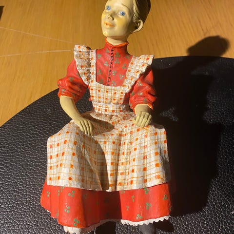 Mariell Design figurgruppe dekorasjon med to barn ved en dam. Motiv med jente i blå kjole omgitt av blåbær og gutt i grønn genser som sitter ved vannkanten. Basen er formet som en dam med blå vannflate og detaljerte blåbær rundt. To runde fordypninger kan brukes til små lys eller annen dekor. Laget som borddekorasjon/pynt, merket «Eksklusiv design Mariell Design Norway» på undersiden.