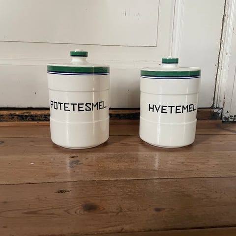3 krukker som er 15 cm høye og 11.5 cm diameter. Ett lokk har en skade og hvetemel krukken har en sprekk men ellers er de andre veldig fine mht alder.