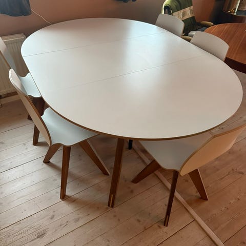 Spisebord med stoler i tre. Bordet har rektangulær bordplate med avrundede hjørner og treben i matchende utførelse. Bordet har noen bruks merker.Det er et klaffbord på 40 cm. Stolene har rygg med horisontale sprosser i tre og sete med mørkt,blå,svart, tekstil. Møblementet passer til spisestue eller kjøkken som spisegruppe for flere personer.