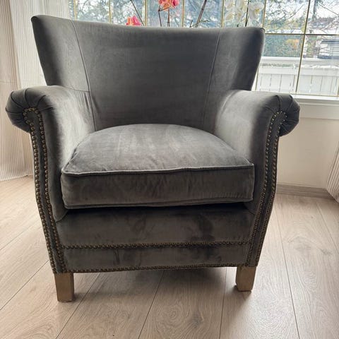 Grå Velour lenestol. Kun vært brukt til "pynt". Ikke vært i daglig bruk.