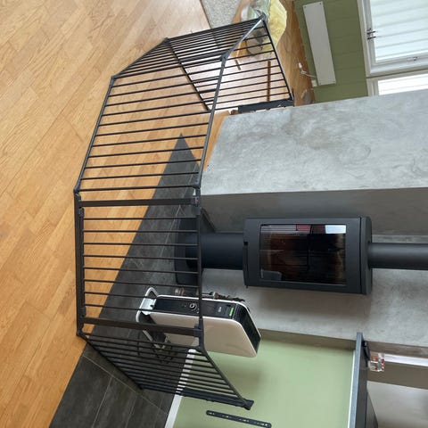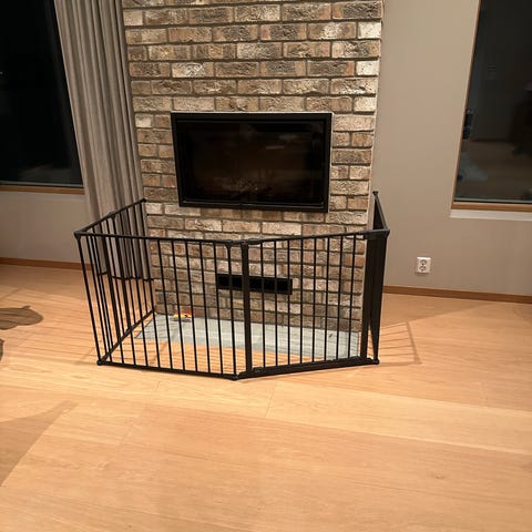 Hvit sekskantet lekegrind i metall. Grindens sider består av vertikale spiler og kan settes opp som en lukket sekskantet innhegning. En av sidene har grindåpning med låsemekanisme. Lekegrinden står på små føtter mot gulvet. Ekstra spiler eller deler følger med på bildet. Egnet som innhegning for små barn innendørs, for å avgrense et trygt lekeområde.