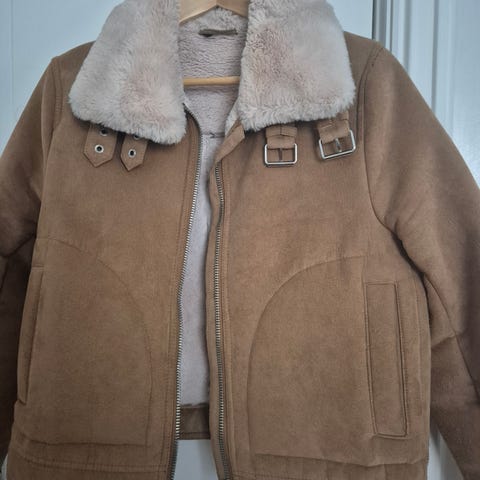 H&M vinterjakke for dame i størrelse M. Jakken er beige og laget i polyester. Den har mykt, teddy-lignende fôr og detaljer langs krage, ermer og kant. Modellen har glidelås foran, sidelommer og spenne-detalj ved kragen. Egnet som ytterjakke i kaldere vær.