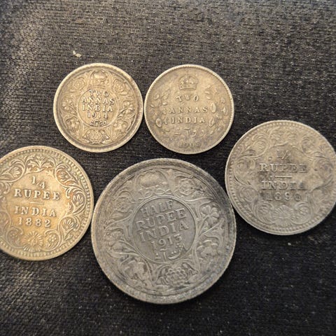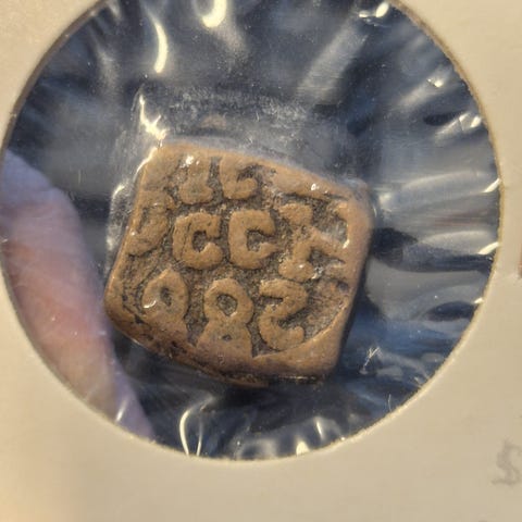 Et indisk sølvstykke fra rundt 250 f.Kr. Er sannsynligvis en såkalt "punch-marked" sølvmynt (karshapana) fra Mauryariket, preget med symboler som elefanter, stupaer, eller solsymboler, og disse er håndpregede med slagstempler på uregelmessige sølvbiter; de er viktige for numismatikere og samlere av antikke mynter.