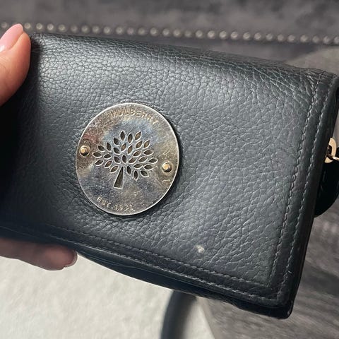Mulberry lommebok for dame i svart skinn med preget mønster. Lommeboken har flere rom til sedler og kort, samt egen seksjon som lukkes med spenne og trykknapper i metall. Praktisk størrelse som får plass i de fleste vesker. Passer til daglig bruk for oppbevaring av kontanter, kort og småting.