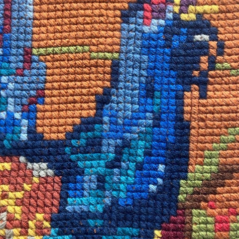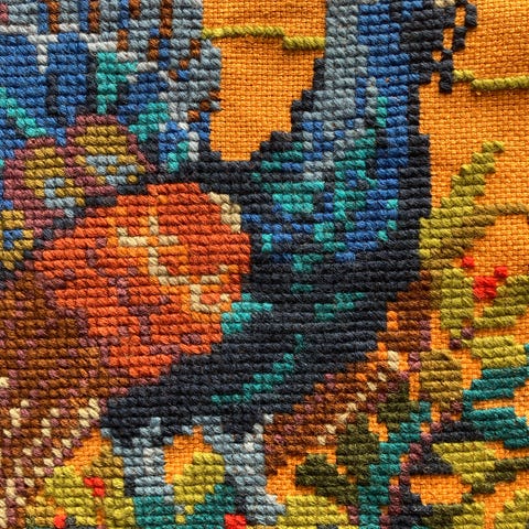norsk - rye - veggteppe - håndknyttet - håndlaget - håndarbeid - håndlaget - husflid - naturmaterial - vintage - retro - modern - hvit - blå - gull - oransje - naturlige materialer - vårlig - sommerlig