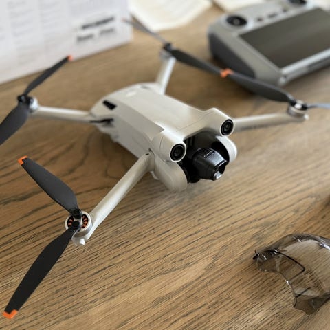 DJI Mini 3 Pro drone med tilhørende smartfjernkontroller. Også kjøpt ekstra batteri og originale nd-filter.