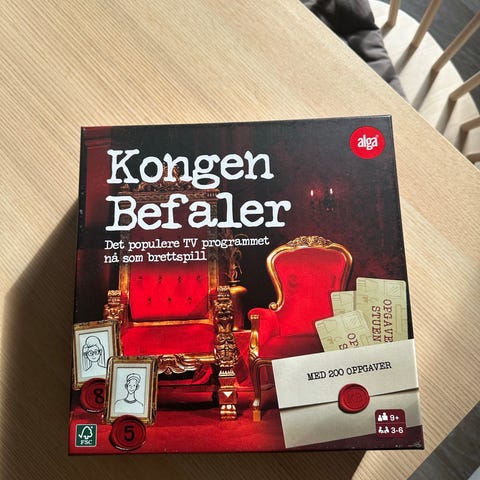 Alga Kongen Befaler brettspill. Spillet er basert på TV-programmet med samme navn og inneholder oppgavekort, spillebrett og tilbehør for gjennomføring av ulike oppdrag og utfordringer. Egnet for flere spillere og beregnet for aldersgruppen fra 8 år og oppover, ifølge esken. Passer som selskapsspill og familiespill der deltakerne løser oppgaver og følger instruksjoner fra «kongen» i spillet. Det kan hentes når som helst(: