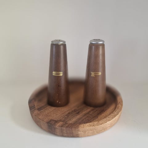 Bøssene har gullfargede topper med hullmønster tilpasset salt og pepper.