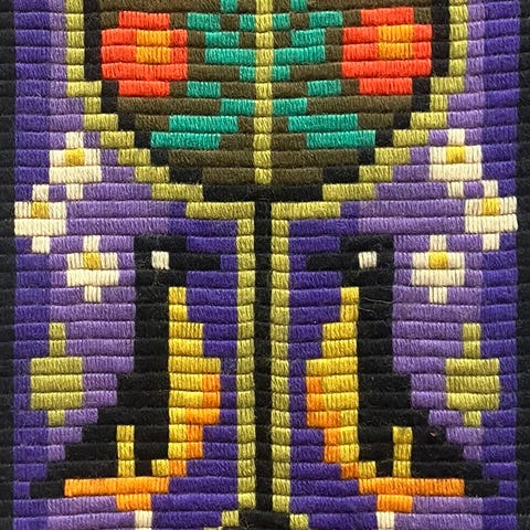 Håndlaget brodert teppe med fargerikt fuglemotiv i ull.