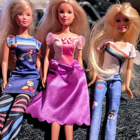 Flere brukte Barbie dukker iført fargerike hjemmelaget klær og tilbehør. En av dukkene har topp i sterk rosa farge og lang skjørt med blomstermønster i flere farger(kr.150) Den har også briller, hårbånd,sko og smykke som tilbehør. På bildene vises også ulike kombinasjoner av klær, blant annet strikket jakke og bukse i matchende farger. Passer til lek og rollelek med andre Barbie-dukker og dukkehus i standard Barbie-størrelse.