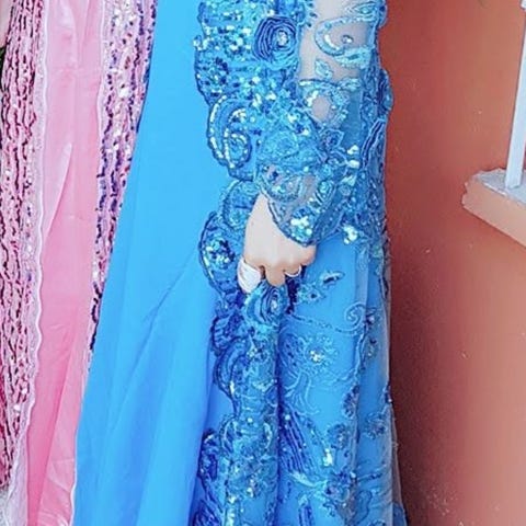 Vakker kurdisk kjole i turkis/blå farge med fine paljetter og broderier.