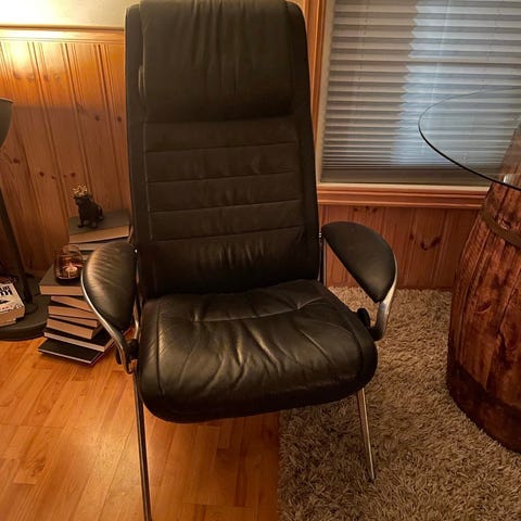 Pent brukt skinnstol i dyp cream med gyllenbrunt treunderstell.