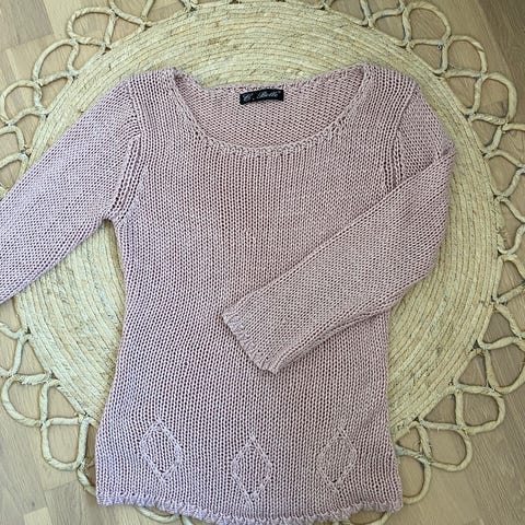 KappAhl genser for dame i størrelse M. Genseren er aprikos/oransje. Den har stretsj-strukturert stoff og dekorative blomsterdetaljer langs utringning.