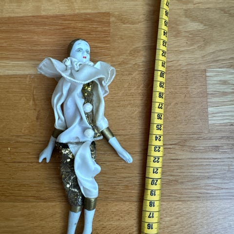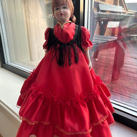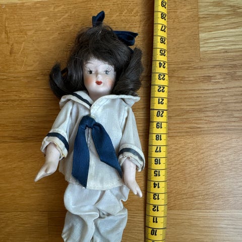 Klassisk dukke med porselenshode og -lemmer kombinert med kropp i tøy. Har et elegant og tidstypisk uttrykk, godt egnet for samlere, restaurering eller som dekor.