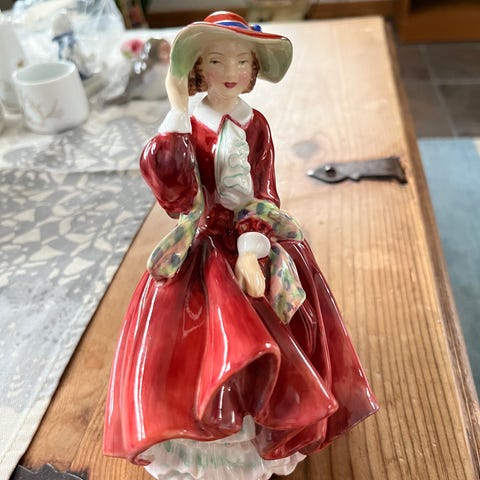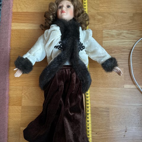 Dekorativ og særpreget dukke med overkropp og hode i porselen, og kropp/underdel i tøy (fra midjen og ned). Dukken er kledd i en rikt dekorert kjole med broderte detaljer og holder et lite instrument. Klassisk uttrykk og godt egnet for samler eller som dekor.