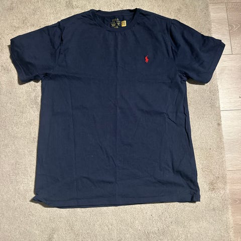 Ralph Lauren Polo T-skjorte for herre i størrelse S. T-skjorten er grå og laget av bomull. Den har rund hals og et lite Polo-logoemblem brodert på brystet. Passer til hverdagsbruk alene eller under andre plagg.