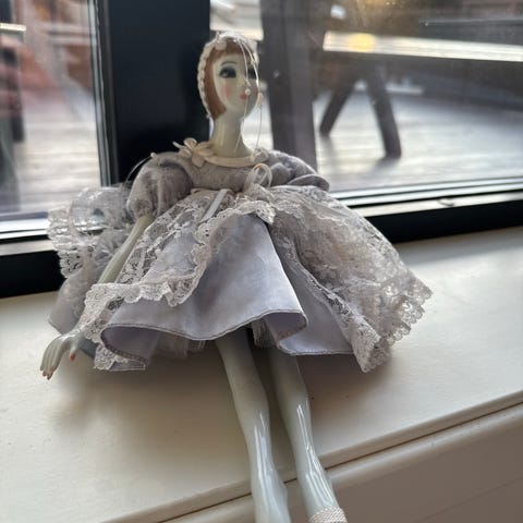 Flott og dekorativ porselensdukke med hode, armer og ben i porselen. Dukken har fyldig hår og er kledd i elegante klær med fine detaljer. God størrelse – se målebånd på bilde for ca. høyde. Passer godt som samlerobjekt eller dekor.