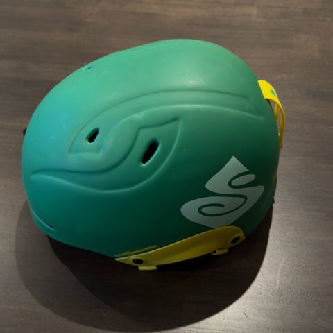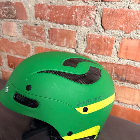 Sweet Protection skihjelm i størrelse M/L (56–59 cm). Hjelmen er grønn med gule detaljer og har justerbar passform med Occigrip-system i nakken.