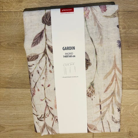 Kid gardin med bladmønster i brun- og naturtoner. Gardinen er lett og noe gjennomsiktig, egnet til bruk i stue, kjøkken eller andre oppholdsrom. Tekstilet har et trykket bladmønster som gir et dekorativt uttrykk. Passer til standard gardinstang eller oppheng, avhengig av sydd topp (ikke spesifisert). Egnet for innendørs bruk i hjemmemiljø. Mål 140x220