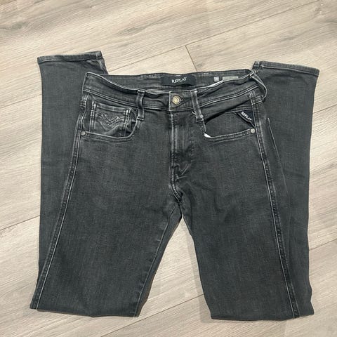 Replay jeans for herre i blå denim. Buksen har livvidde W29 og tilsvarer omtrent størrelse XS. Lengden på buksen er 30