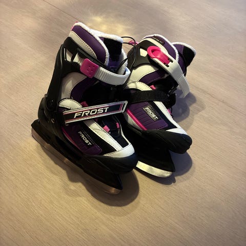 Frost barne skøyter for ishockey i størrelse 29. Modellen har justerbar plastkonstruksjon med spenner og borrelås for enkel tilpasning. Overdelen er i syntetisk materiale i lilla, hvit, svart og rosa. Innvendig er det polstret fôr for bedre komfort. Skøytene har stålskinne tilpasset ishockeybruk og er egnet for barn som trenger stabile skøyter til lek og trening på is.