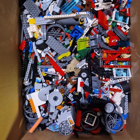 Pakke med lego batman. Blant annet mye av delene til batwing. Den er ikke komplett men kan bygges og lekes med. Deler til begge vinger er med, delene til vinge nummer to ligger i posen.