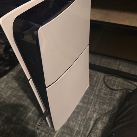 Sony Playstation 5 spillkonsoll i hvit farge. Konsollen har karakteristisk vertikal design med hvite sideplater og sort midtseksjon. Fronten har tilgjengelige porter for tilkobling av kontroller og annet tilbehør. Egnet for bruk med kompatible Playstation 5-spill og tilkobles TV eller skjerm via HDMI. Strømtilkobling skjer via standard strømkabel på baksiden. Eventuelle medfølgende kabler, kontroller eller annet tilbehør må spesifiseres av selger.