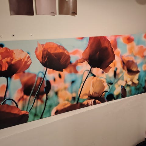 70×50 cm , fugl og rosa blomster på plate, små bruksmerker.