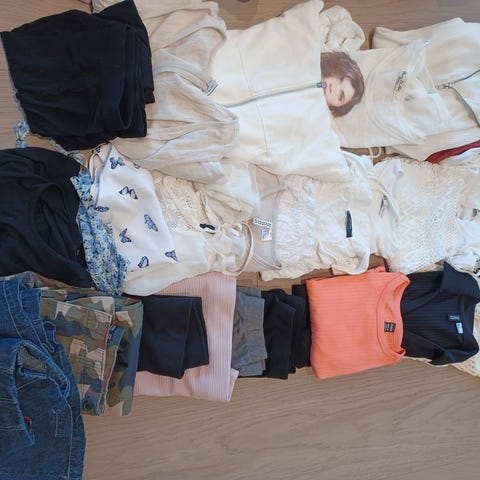 En stor pose med dameklær i str S/M, selges da det ikke blir brukt lenger. Mye bruk igjen i klærne. Inneholder 2 dongeribukser, tre strikkagensere, en hekla cardigan (noen løse tråder), ett skjerf, en del t-skjorter/topper, short, skjørt, skinnsjakke