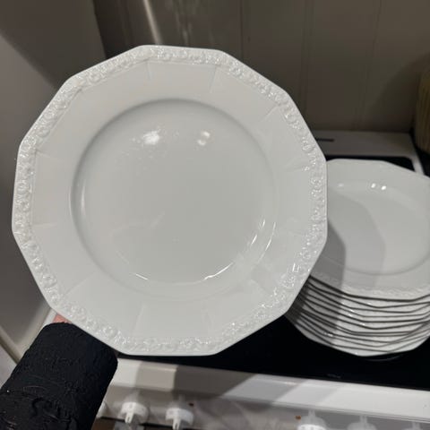 Rosenthal Thomas servise i hvitt porselen. Settet består av tallerkener og boller i ulike størrelser, både firkantede og runde former. Nøytralt hvitt design som passer til selskapsdekking. Produsert i Tyskland, merket "Thomas Rosenthal Group Germany" på undersiden av delene. 14-15 av de fleste tallerknene/skålene. 10 stk av de største tallerkene.