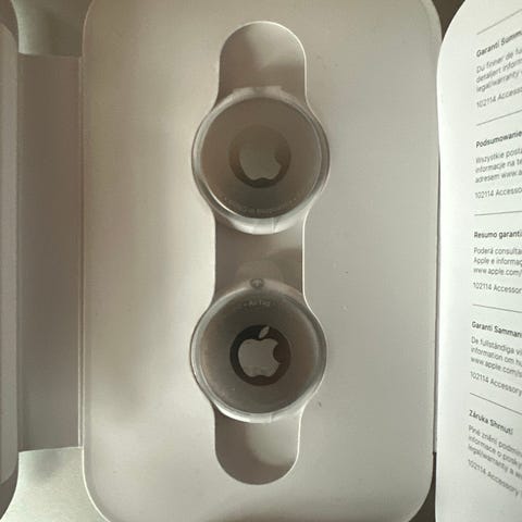 Apple AirTag sporingstilbehør. Pakken inneholder runde sporingsenheter med Apple-logo, beregnet for å festes på eller legges i eiendeler for enklere lokalisering via app. Helt uåpnet 2 for 450kr