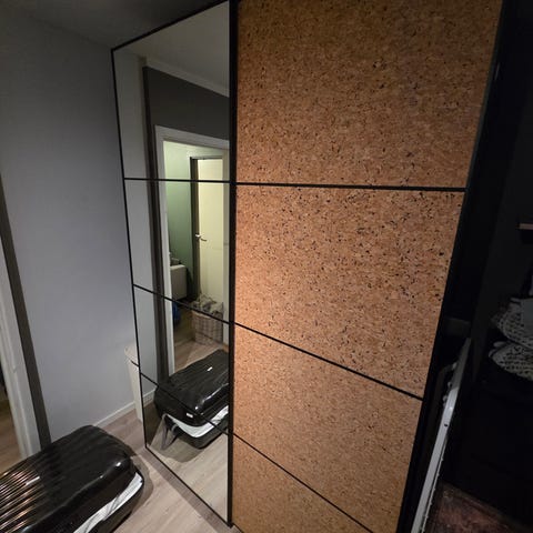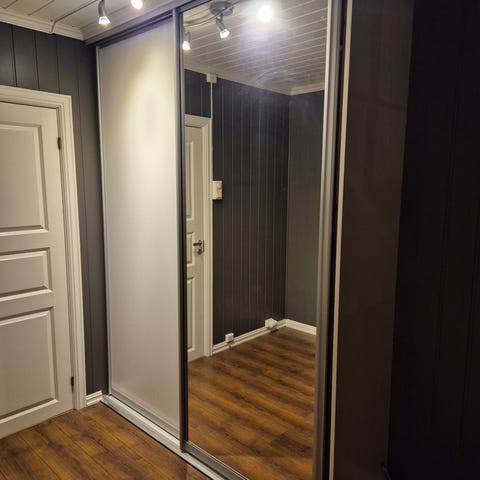 Skyvedører med speil til salgs, 2 stk. Usikker på kvar dei er kjøpt. Supre å montere framfor f.eks. innebygde skap. Bredde er 51 cm per dør, og ca 8 cm totalt.