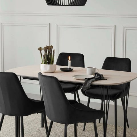 Rundt, svart spisebord med tilhørende 4 spisestoler selges samlet.