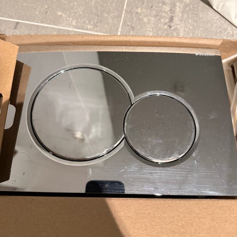 Toalettbetjeningsplate med to spyleknapper. Rektangulær frontplate i brun utførelse, levert i eske med tilhørende innfesting. Passer til innbyggingssisterne som er tilpasset denne typen betjeningsplate. Egnet for montering på vegg over toalett for styring av liten og stor spyling.