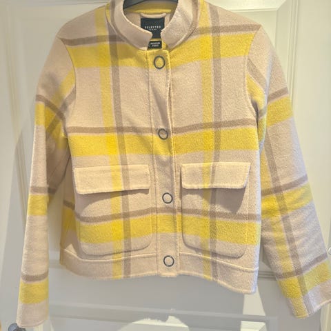 Selected Femme jakke for dame i størrelse M. Jakken er svart og laget av 100 % ull. Modellen har rund hals uten krage, lange ermer, skulderputer og knepping foran. Den har en enkel, rett passform og lommer foran. Ikke brukt, da den var litt stor for meg. Nypris 1199kr.