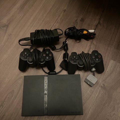 Sony PlayStation 2 Slim spillkonsoll i svart farge, modell SCPH-77004. Konsollen er PAL-versjon og drives med 8,5 V likestrøm. Bildene viser at det følger med strømforsyning og kabler, samt to kontroller med kabel. Passer til PlayStation 2-spill og tilkobling til kompatibel TV eller skjerm med riktig videokabel og strømtilkobling.