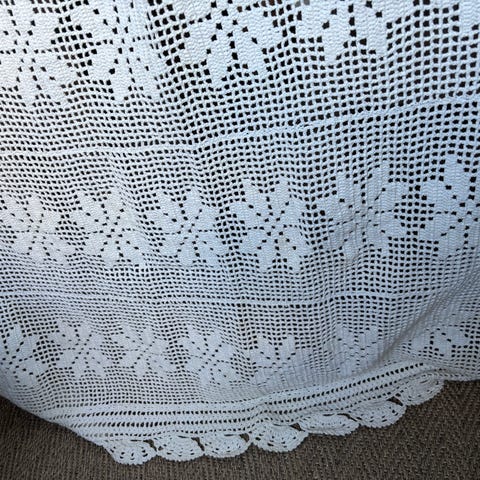 Heklete sengetepper i hvit farge. Tepper med ulike gjennombrutte mønstre og ruter, egnet som sengeteppe over dobbeltseng eller enkeltseng avhengig av mål. Materialet fremstår som bomullsgarn eller tilsvarende heklegarn. Passer som dekorativt overkast på soverom eller som stort pledd i stue. Flere ulike mønsterfelt gir et detaljert og tradisjonelt uttrykk.
