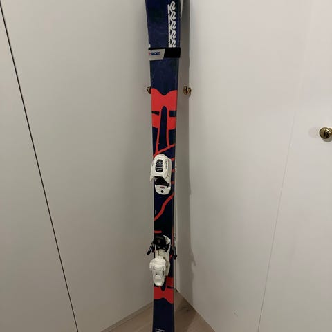K2 alpinski med Marker-bindinger. Skiene har grønn og lilla såle og mørk overside med grafiske detaljer. Skiene er godt brukt men for noen som vil prøve seg i bakken eller noen som trenger ett sett ekstra i parken er de gode.