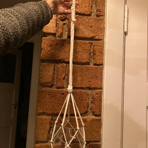 Granit makramé plantehenger i naturhvit bomullssnor. Henger med knyttede detaljer og opphengsring øverst, egnet for å holde en blomsterpotte eller glasskrukke. 20,- pr stykk alle for 50,-