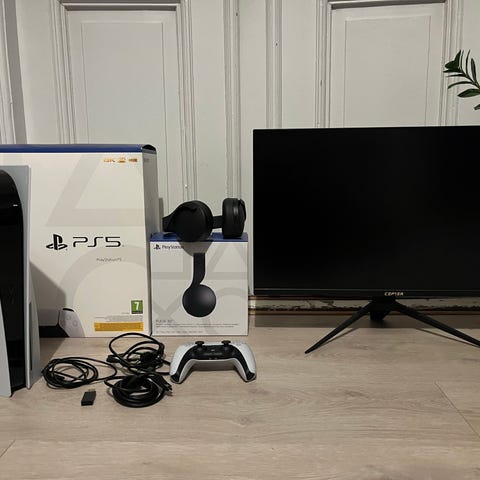 Sony Playstation 5 spillkonsoll i hvit farge. Konsollen har karakteristisk todelt frontpanel i hvitt med svart midtparti. Medfølgende kontroller er en DualSense-kontroller i hvitt og svart. Egnet for spilling av Playstation 5-spill og kompatible Playstation 4-titler, samt bruk av ulike strømmetjenester og medier, avhengig av modell og tilkoblinger som følger med fra produsent.