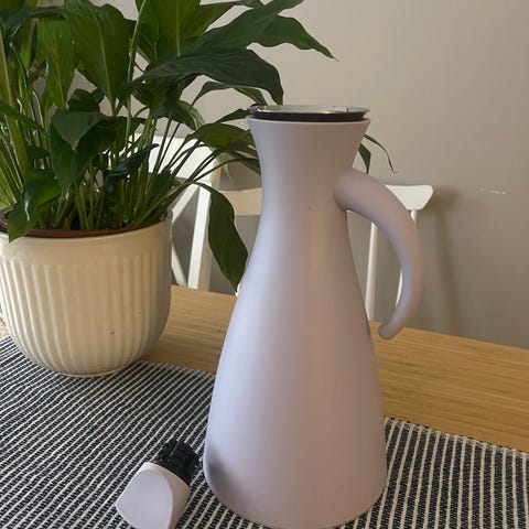 Eva Solo termokanne i grå farge. Kannen har helletut og håndtak, samt lokk som kan skrus av og på. Innsiden er i metall, noe som bidrar til å holde drikken varm eller kald over tid. Passer til servering av kaffe, te eller andre varme og kalde drikker på kjøkkenet eller ved bordet.