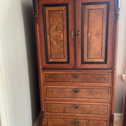 hjørneskap i tre, sannsynligvis i allmoge- eller bondestil, som er en vanlig type eldre møbel i Norge og Skandinavia. Skap av denne typen er ofte fra 1700- eller 1800-tallet og har historisk preg.