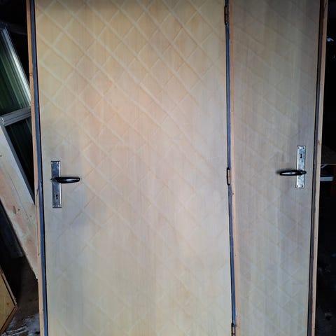 Teak ytterdør med lås og nøkler i god stand. Sidefelt i teak med glassvindu. Dør b 93, sidefelt b 38,5. h 193. Rammekarm ca. på 3 - 3,5 cm. Total h 199-199,5.