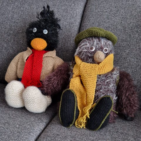 Håndlagde strikka og hekla Solan og Ludvig. Strikka i vestlandsgarn og pelsgarn. Vest og caps er hekla. Sekk er sydd av filt og hatt er formet i filt med bånd .